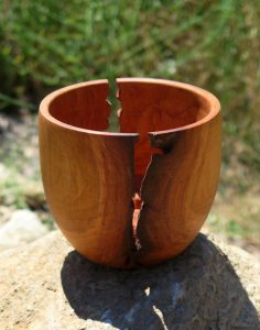 Au final, c’est souvent le bois qui décide de la finalité de la pièce et il n’est pas rare qu’une fente, une gerçure, un nœud, transforme un bol en coquetier ou un pilon en pique à cheveux !